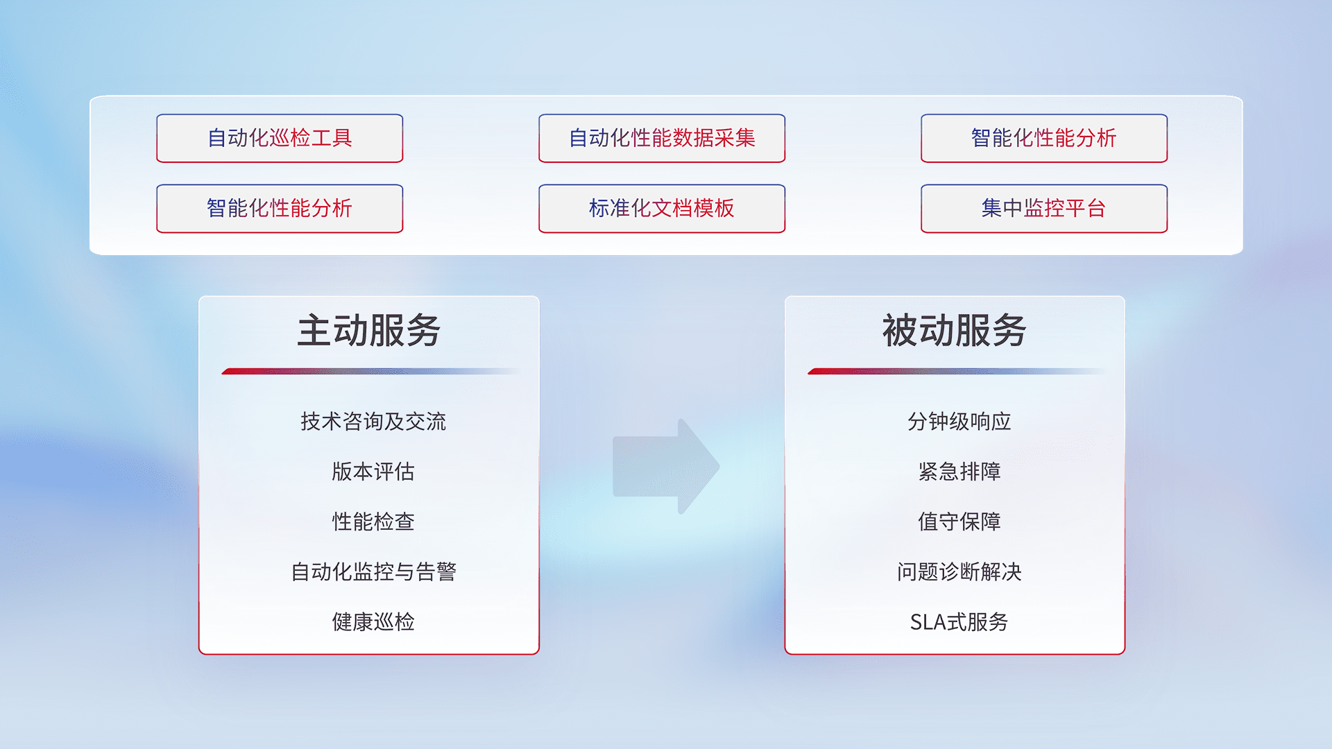 智能化工具和标准化文档,,,,保障服务质量,,,,提供主动服务(包含技术咨询、、、、版本评估、、、、性能检查、、自动化监控与告警、、、健康巡检)和被动服务包含(分钟级响应、、、、紧急排障、、值守保障、、问题诊断解决、、、、SLA服务)。。
