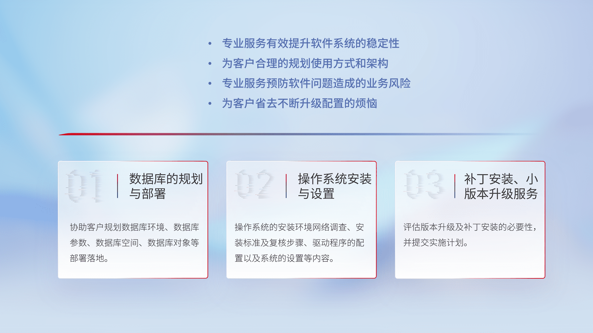 为客户提供软件规模升级、、、快速部署、、、、按需配置的专业服务,,从数据库的规划与部署到操作系统的安装与设置,,,,再到补丁安装和小版本升级提供支持。。。